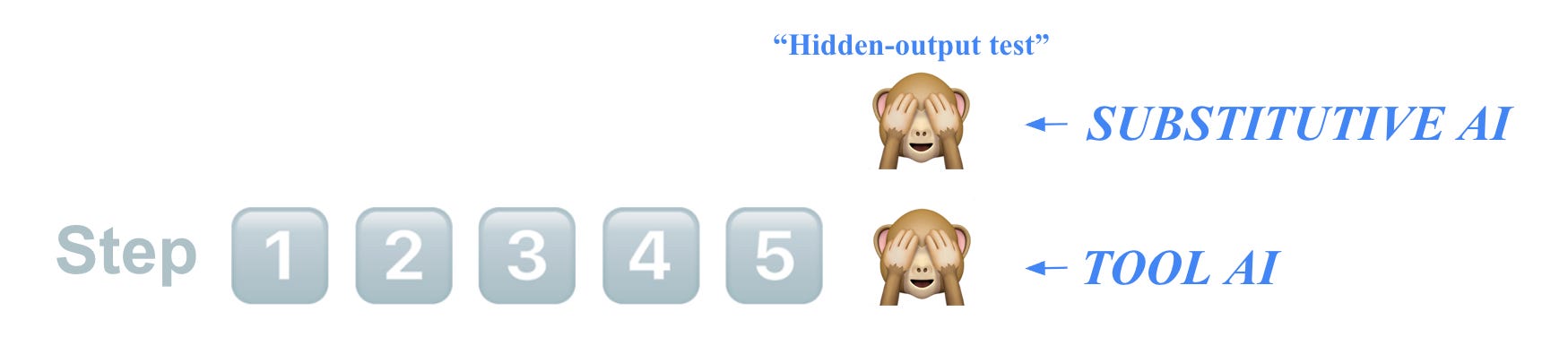 The quality of the responses to the Hidden-Output Test form the guardrail surrounding our notion of meaning. If substitutive AI was used, there’s no way for the human to know answers to the interviewer’s questions—the interview subject will draw a blank, since the output was generated instantly with no human practical reasoning regarding the practice’s indeterminate standards.7 Even if they have some broad idea of what might be behind the curtain through their understanding of how the practice works, the case-specific details will be lacking in accuracy, thereby exposing the use of AI.